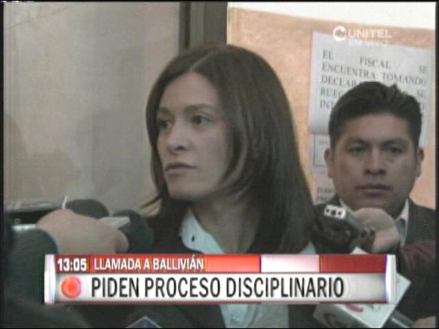 La Paz.- La llamada entre el Fiscal Carlos Fiorilo y la ex presidente de la ABC, Patricia Ballivián habría sido grabada el año 2006 cuando el Fiscal informaba a Ballivián sobre posibles procesos en su contra. La ex presidenta de la ABC compromete la intervención del Ministro Juan Ramón Quintana.