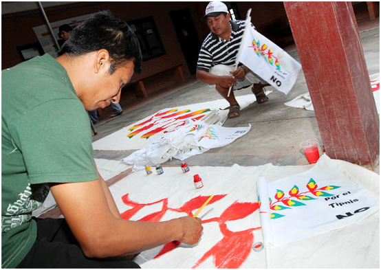 Preparativos. Dos originarios pintan banderas y pancartas con la flor del patujú que llevarán a la IX marcha indígena. Foto El Deber