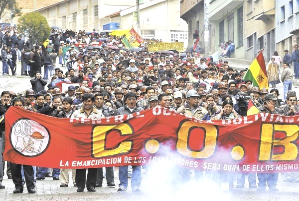 cob-movilizacion Una contundente huelga general comenzó el día de hoy en Bolivia, con una masiva manifestación de trabajadores que fue duramente reprimida por fuerzas policiales enviadas por el gobierno de Evo Morales.