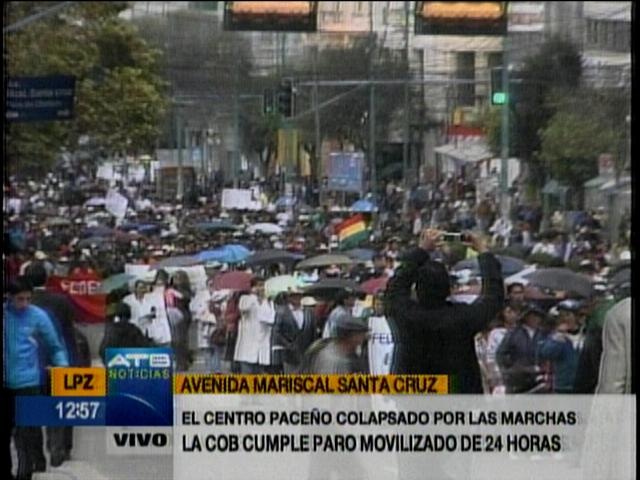 La Paz.- Esta mañana se realizó la marcha de protesta convocada por la Central Obrera Boliviana, la protesta es a nivel nacional y por 24 horas, en la que se demanda atención de las autoridades a una serie de demandas, entre las que destacan incremento salarial, solución al problema médico, creación de fuentes laborales y reactivación del aparato productivo.