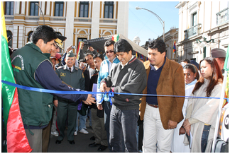 El presidente, Evo Morales, junto al ministro de Salud, Juan Carlos Calvimontes, el director de la Agencia para el Desarrollo de las Macroregiones de Zonas Fronterizas (Ademaf), Jerjes Mercado y representantes de la embajada de Venezuela fue el encargado de iniciar la primera fase del desplazamiento de 16 consultorios móviles que recorrerán los departamentos de La Paz, Santa Cruz y Cochabamba por el periodo de 23 días.