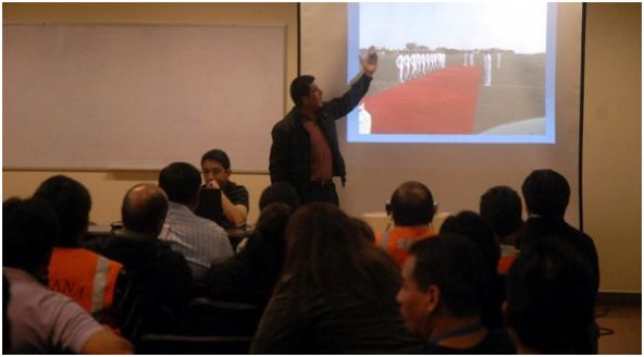 Fernando Huanacuni (de pie), ayer durante un taller en el aeropuerto de Cochabamba.