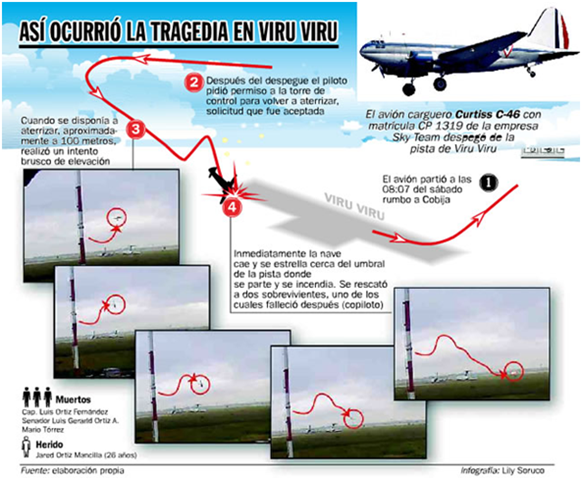 Víctimas. En el accidente aéreo del Curtiss murieron Luis Ortiz Fernández (piloto), Gerald Ortiz Alba (copiloto) y Mario Tórrez Angles (mecánico). Resultó herido Jared Ortiz Mancilla.