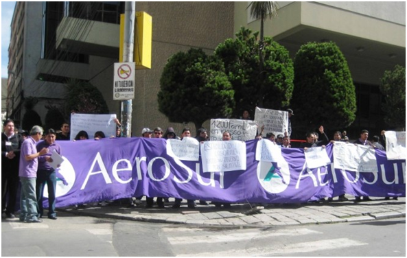 La Paz, 26 Abr. (ANF).- El sindicato ad hoc de los trabajadores de la empresa aeronáutica AEROSUR demandaron este jueves del Gobierno central y de los Ministerios de Obras Públicas y Trabajo, la aplicación inmediata de la Constitución Política del Estado (CPE), en defensa de sus fuentes laborables y por las cuales no están recibiendo salarios desde hace siete meses, en algunos casos.
