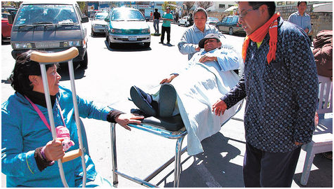 Pacientes. En La Paz, los pacientes del Hospital Obrero se organizaron y salieron a protestar a las calles aledañas al nosocomio para que se anule el decreto 1126 y en respaldo a los profesionales y trabajadores. Usando sus sillas de ruedas, muletas y camillas, en las que fueron cargados algunos enfermos, los pacientes hicieron un plantón de más de media hora.