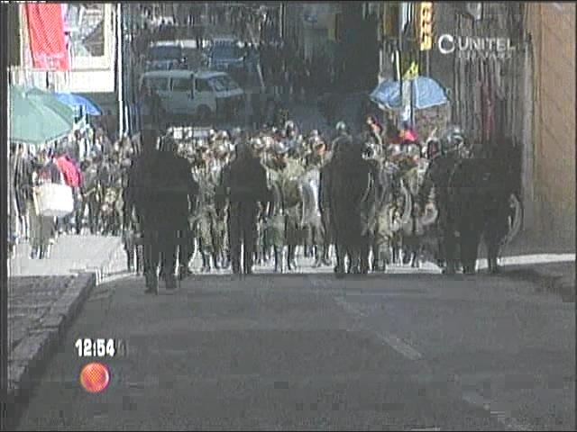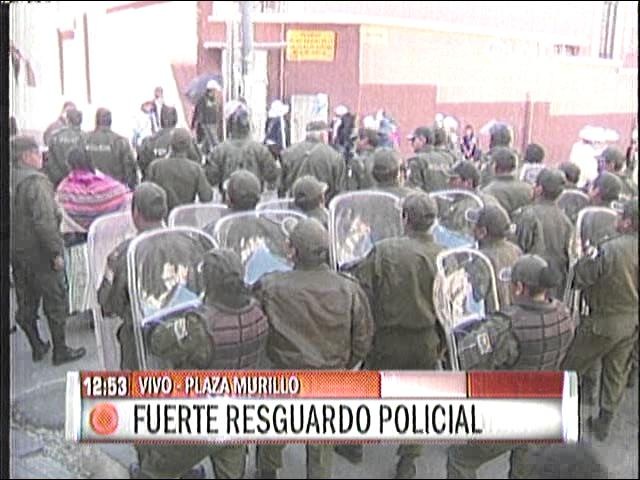 La cabeza de Juan Carlos Trujillo está en la calle Potosí está llegando a la calle Socabaya donde ha reforzado los accesos a la Plaza Murillo, a la altura del Obelisco se ha apostado un Neptuno.
