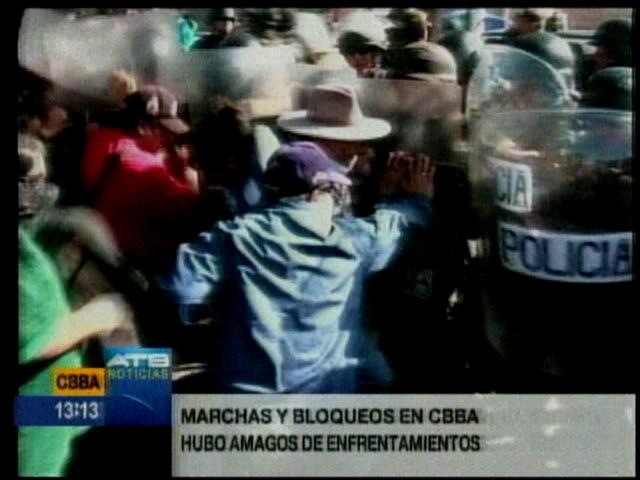 Marchas y bloqueos en Cochabamba, la Policía usa escudos y gas pimienta
