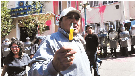 image Amenaza. En La Paz, un trabajador de salud muestra una jeringa cargada con un supuesto químico.