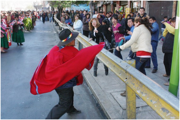 Las organizaciones sociales que apoyan a Evo Morales actúan con violencia, como ocurrió ayer: Un campesino azota a un transeúnte que criticó la movilización progubernamental en La Paz. Foto La Prensa