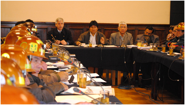 El presidente Evo Morales y el Vicepresidente Álvaro García Linera, acompañados por los ministros de Minería, Economía, Trabajo y Salud llegaron hasta el edificio de la Vicepresidencia del Estado, para dialogar con 46 delegados de las cooperativas mineras que operan en todo el país