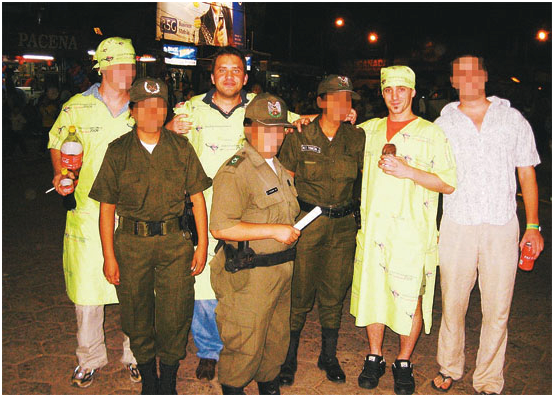 De fiesta. Tóásó y Árpad (rostros descubiertos), del grupo de Eduardo Rózsa, junto a mujeres policías, en el carnaval 2009.