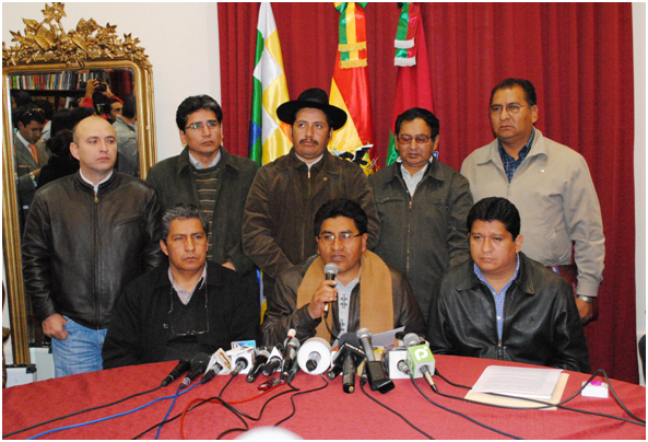 Los gobernadores de Cochabamba, Edmundo Novillo; de Beni, Haisen Ribera, de La Paz, César Cocarico, de Chuquisaca, Esteban Urquizu; de Oruro, Santos Tito; de Pando, Luis Adolfo Flores, de Potosí, Félix Gonzales y de Tarija, Lino Condori, emitieron este martes, desde la sede de Gobierno, un pronunciamiento conjunto para condenar los afanes golpistas mediante un supuesto plan TIPNIS.
