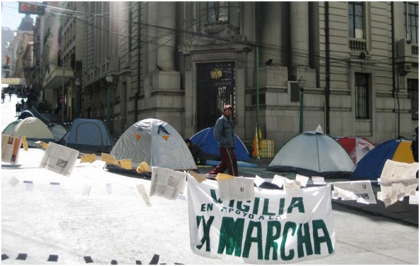 Por lo menos un centenar de indígenas permanece en una vigilia constante en la intersección de las calles Mercado y Potosí, sobre la calle Ayacucho frente a las puertas de la Vicepresidencia del Estado Plurinacional.