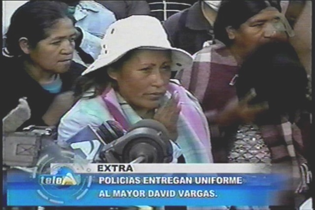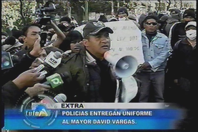 Los policías en su mitin frente a esta Cartera de Estado, realizaron un reconocimiento al mayor David Vargas, activo participante de las jornadas de febrero de 2003 en la movilización policial de esa época, y le entregaron un uniforme policial. Inmediatamente uniformado procedió a emitir órdenes a la tropa.