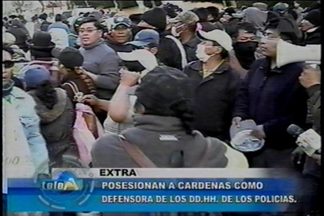 Por aclamación los policías movilizados designaron a Guadalupe Cárdenas, dirigente de las Esposas de Policías, como la nueva Defensora de los Derechos del Policía. El juramento de rigor estuvo a cargo del mayor Vargas. (Cadena A)