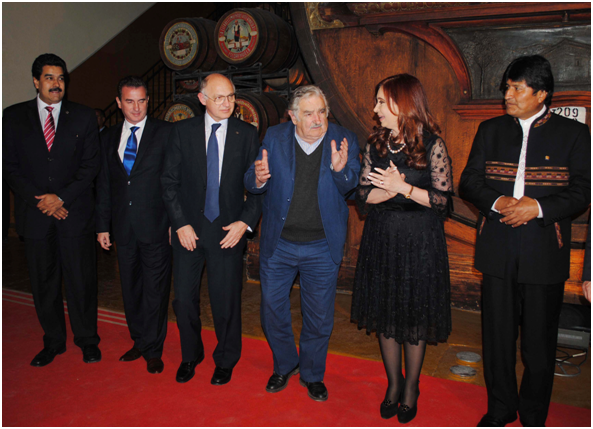 imageEl Presidente Evo Morales junto a los mandatarios de Argentina, Cristina Fernández de Kirchner, y de Uruguay, José Mujica en el marco de XV Cumbre del Mercosur, Mendoza, el 28 de junio 2012. (Foto ABI)