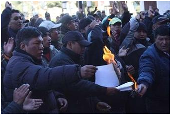 En otras ciudades queman el acuerdo y la whipala. Foto: Efectivos de civil rompen el convenio firmado con Gobierno. APG
