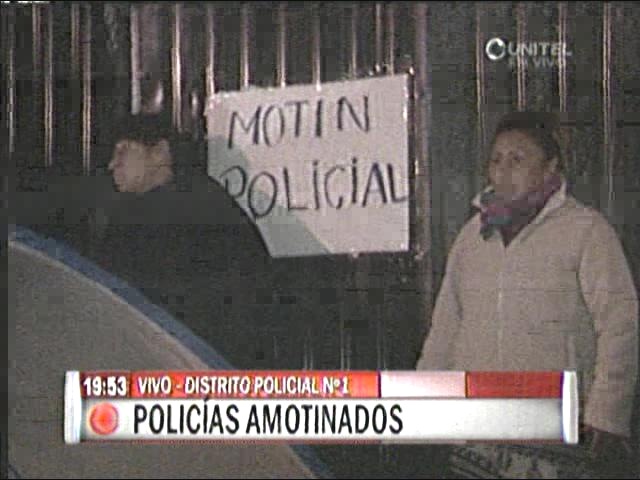 Tv noticias. En el Distrito Policial Nº1 hay 180 policías amotinados. En Santa Cruz advierten con suspender patrullaje el fin de semana.