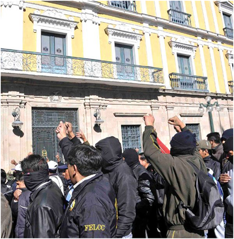 Morales retornó al país para verificar la situación con la Policía. En la foto efectivos de la institución del orden protestan frente a un Palacio de Gobierno, cerrado y sin ninguna autoridad en su interior.