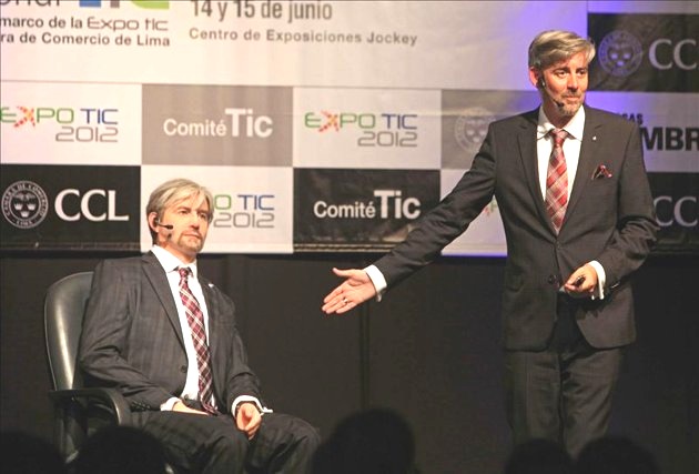Durante la inauguración de ExpoTic 2012, la primera feria y congreso internacional de infraestructura e innovación tecnológica que se celebra en Lima hasta el sábado, Scharfe presentó a Geminoid-DK, un robot creado a su imagen y semejanza, capaz de imitar sus movimientos faciales y mantener conversaciones con su ideólogo.