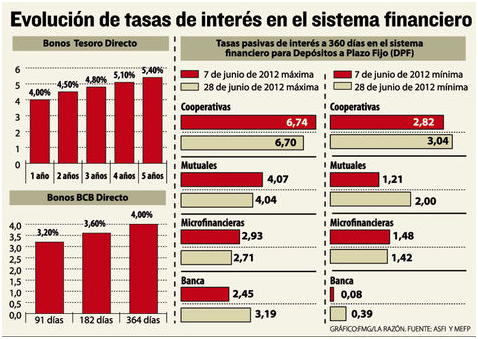 Luego del lanzamiento de los bonos “Tesoro Directo”, las tasas de interés para los ahorristas del sistema financiero registraron diversos incrementos en la banca, cooperativas, mutuales y entidades microfinancieras. Los depósitos en el sistema se redujeron en más de $us 120 millones.
