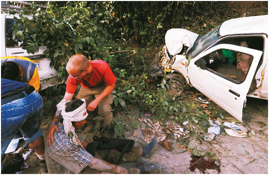 Dolor. Uno de los heridos del accidente de ayer. Se atribuye el embarrancamiento de la camioneta en la que viajaba a un reventón de una llanta delantera