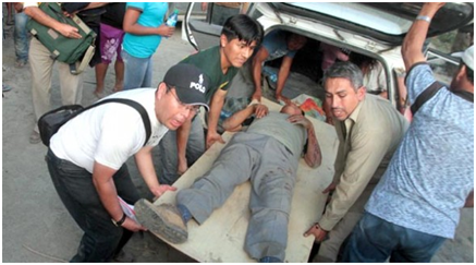 Dos pasos más allá, un hombre le pide a gritos a Lucera Cunay que no se duerma, aunque ella parece no entenderlo. Al frente, una camioneta blanca aparece con la trompa abollada mientras unos enfermeros colocan una cuellera a Aldo Moreno para inmovilizarlo. A su lado está sentado Yoisi Fabricano Román, al que le han atado un trapo blanco en la cabeza para tratar de frenarle la hemorragia. Entre ellos y el cuerpo de Otilia, dos charcos de sangre quedan como huellas de una tragedia.