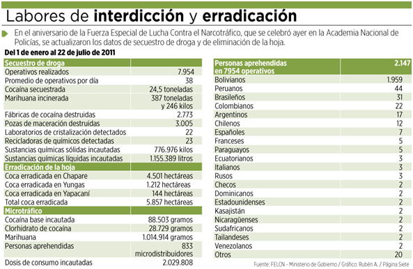 El jefe de la Oficina de Naciones Unidas Contra la Droga y el Delito, César Guedes, dijo en oportunidades anteriores que “Bolivia ahora es un problema de Brasil, no es un problema de Estados Unidos, porque la droga boliviana está en la puerta brasileña y muy lejos de la puerta (norte) americana”.
