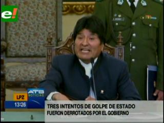 “Nuestro gobierno gracias a las fuerzas sociales de Bolivia derrotamos tres golpes de Estado. Un revocatorio 2008, el segundo golpe la marcha del año pasado de la CIDOB. Los hermanos indígenas decían ésta marcha es para tumbar a Evo” añadió.