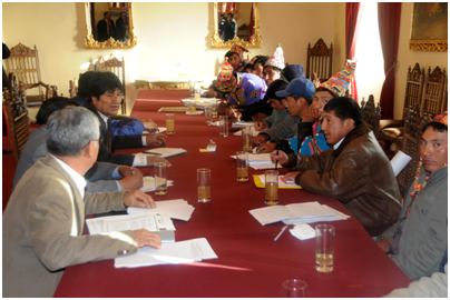 imageLa reunión del Presidente Evo Morales, el ministro de Minería y el gobernador de Potosí con representantes de la comunidad de Mallku Qota, hoy en palcio de gobierno(Foto ABI).