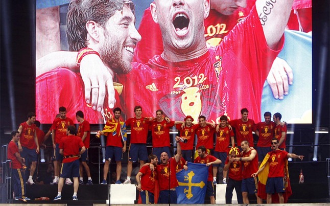 Un día después de conquistar en la Eurocopa de Polonia/Ucrania su tercer título grande consecutivo, la selección española de fútbol se dio un baño de multitudes en una larga jornada que comenzó con las visitas institucionales y culminó con la celebración junto a una hinchada enfervorecida. Alrededor de medio millón de aficionados colapsaron el centro de Madrid y la Plaza de Cibeles, el destino final del autobús con los integrantes de una selección que el domingo entró en la leyenda al conquistar la triple corona: dos Eurocopas y un Mundial en cuatro años. Un grito fue el más repetido durante toda la jornada: