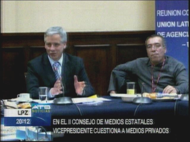 La Paz.- El vicepresidente del Estado Plurinacional Álvaro García Linera en el “II Encuentro de la Unión Latinoamericana de Agencias de Noticias”, manifestó que en Bolivia existen partidos políticos que se atrincheran en medios de comunicación privados.