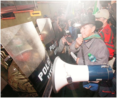 Ref. Fotografia: Demanda. Fernando Vargas, dirigente del Tipnis, trata de disuadir a los policías.