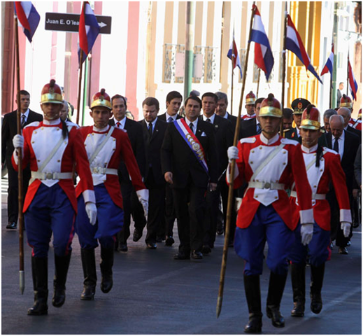 Informe. El presidente paraguayo, rodeado por militares y sus ministros cuando llegaba al Congreso Nacional