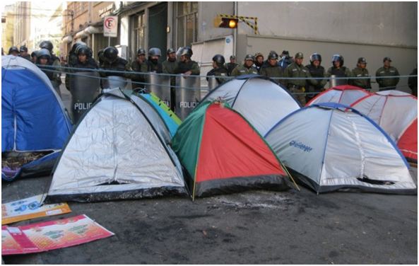 La Paz, 9 Jul. (ANF).- Centenares de policías se movilizaron la madrugada de este lunes por alrededores de la plaza Murillo, como una forma de hostigamiento a la vigilia de la novena marcha que se encuentra apostada en inmediaciones de la Vicepresidencia y las calles Potosí, Ayacucho y Mercado desde hace diez días, denunció el ex dirigente del Consejo Nacional de Ayllus y Marcas de Qullasuyo (CONAMAQ), Rafael Quispe.