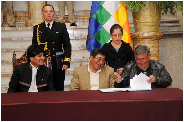El Presidente Evo Morales participo este lunes de la firma de acuerdo entre el Gobierno y la Confederación de Choferes de Bolivia, además de la dirigencia de La Paz y El Alto, para establecer la renovación del parque automotor. (Foto ABI)