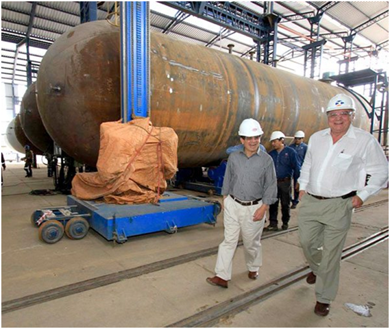 Carlos Villegas (izq) junto al empresario Carlos Caballero durante la visita a los tanques que almacenarán gas licuado de petróleo. Cada uno mide 38 metros.