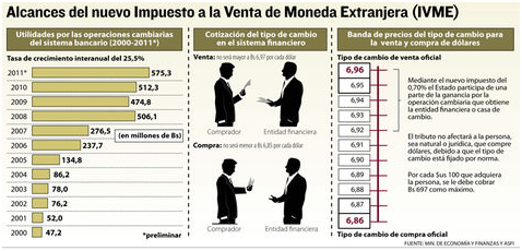 “Es un impuesto a la ganancia bancaria porque en los bancos, por el buen estado económico, están teniendo buenos ingresos. Solamente por cambiar dólares y vender dólares la banca el año pasado (2011) ha ganado $us 84 millones”, señaló.