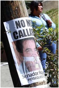 Afiches del senador refugiado en la embajada brasileña Roger Pinto en plaza Villarroel de la ciudad de La Paz. Foto archivo Página Siete.