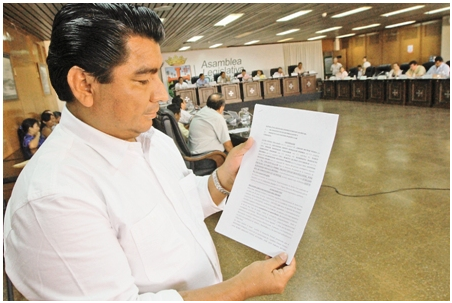 Ref. Fotografia: Documento. El asambleísta del MAS, Lucio Vedia, muestra la querella que presentaron contra el gobernador Costas.