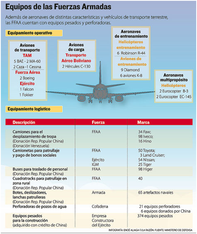 “Los equipos y medios tácticos se encuentran hoy reducidos a su mínima capacidad de operación”, refiere el plan de desarrollo nacional en materia de defensa 2005-2011.Dirección “El Gobierno ha priorizado en esta gestión gubernamental el equipamiento operativo y logístico de las Fuerzas Armadas. De momento no se ha logrado mayores avances en equipamiento bélico”.