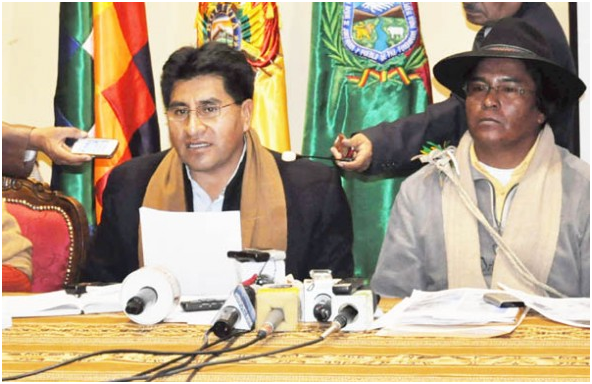 CONFERENCIA. El gobernador César Cocarico y el dirigente campesino Florencio Condori, ayer.