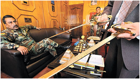 La Paz. El general Félix Rojas, en su despacho, cuando su abogado exhibió a este diario los espadines.