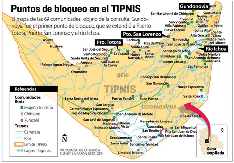 A siete días de iniciada la consulta, 11 de 12 comunidades apoyaron el paso de la vía por medio del TIPNIS, según el Gobierno. Mientras tanto, los indígenas opuestos al proceso extienden el “bloqueo” de ríos fuera del poblado de Gundonovia y ocupan otros tres puntos estratégicos para neutralizarlo.