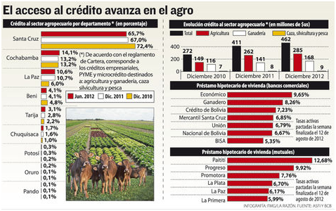 Según datos oficiales de la Asfi, entre 2010 y junio de 2012, el crédito agropecuario aumentó en 69,8%, al pasar de $us 272 millones a $us 462 millones y se estima que suba aún más hasta fin de año. El Ministro de Economía anunció, el 26 de abril, que las entidades financieras, “en el plazo más breve posible”, deberán asignar el 20% de su cartera de créditos al sector productivo.