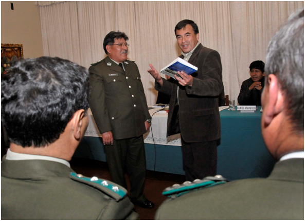 El ministro de la Presidencia Juan Ramón Quintana, presenta su libro “Policía en Bolivia”, ayer 8 de agosto de 2012. Foto ABI.