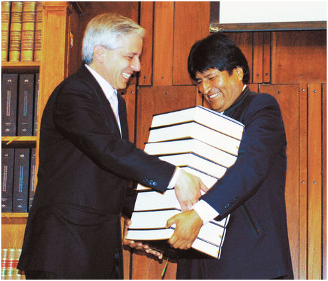 Texto. El vicepresidente Álvaro García Linera entrega los ocho tomos al presidente Morales. Foto: ABI
