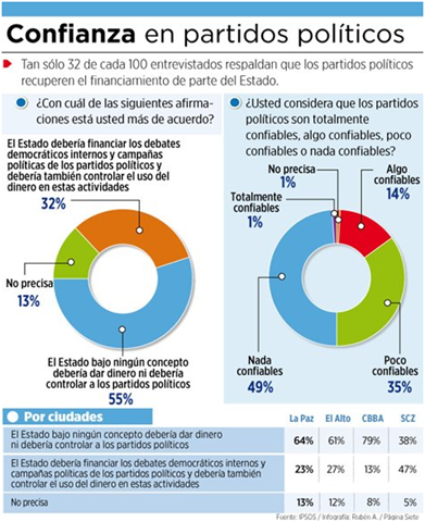 De acuerdo con la última encuesta de IPSOS para Página Siete, 55% de los pobladores del eje central de Bolivia opina que las fuerzas políticas que participen en los comicios futuros no deben recibir ninguna clase de recurso estatal para gastarlo en actos proselitistas.