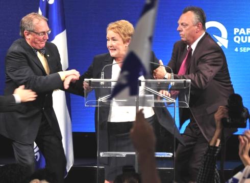 Pauline Marois, la primera ministra de Quebec, acababa de decir a sus simpatizantes en la celebración que la provincia será independiente un día cuando los guardaespaldas la retiraron apresuradamente del escenario. Posteriormente regresó para terminar su discurso.