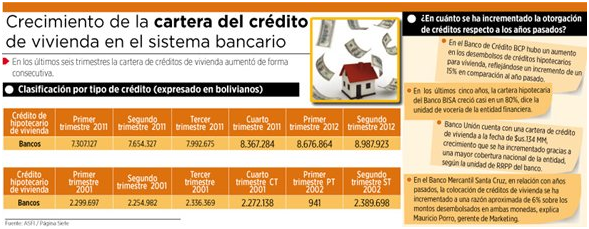 Por otro lado, la vivienda propia es una legítima ambición de todo grupo familiar, sea cual sea su nivel económico. Por tanto, se ha creado un interesante mercado en Bolivia para este tipo de créditos, con la ventaja adicional de que disponiendo del 20% del valor de la vivienda y teniendo un trabajo estable, el demandante del crédito no necesita ni garante ni otra garantía adicional, el propio inmueble garantiza su crédito.